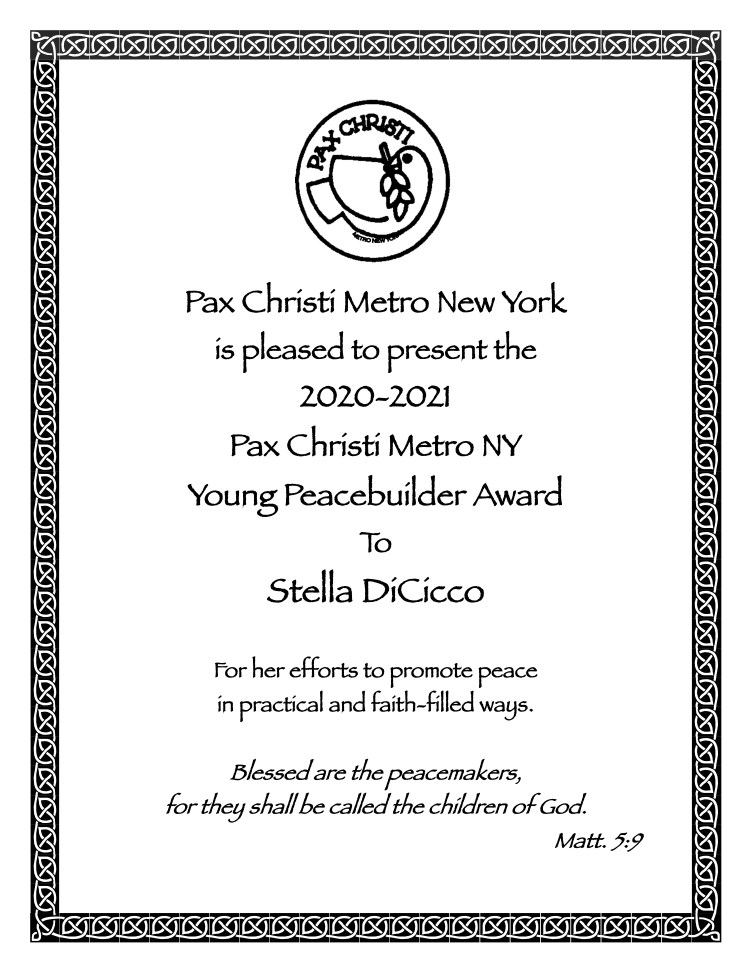 Stella DiCicco was nominated by her teacher, Shannon Tobin who wrote, ”Stella has demonstrated outstanding leadership, vision, and an inclusive outlook to include more of the students in peace-building activities.”