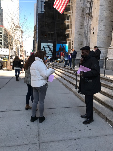 We were blessed with unusually beautiful weather for March 2nd in NYC, and different people shared different, but good responses from those who took the leaflets. Just one person returned the leaflet because she said she is Russian, but she was very polite and pleasant about it. Edith got to teach three people about ashes. All in all, a good day’s work.